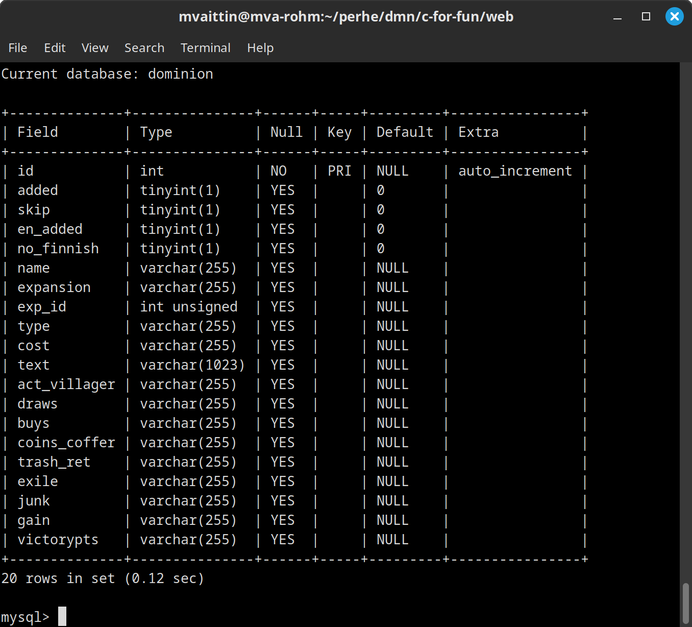 Niinpä oli aika loikata teknologioissa eteenpäin ja korvata kortit sisältävä tekstitiedosto MySQL tietokannalla. Tavoilleni uskollisena, koodailin tähän konvertointiin sopivan työkalun - milläpä muullakaan kuin C:llä. Näin sai alkunsa työkalu nimeltä 'dice-admin'. Ensimmäinen dice-adminin git-repooni tuonut committi löytyy täältä.